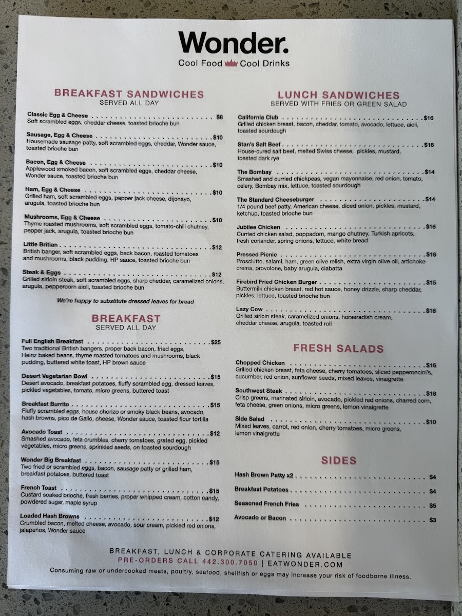 The menu at Wonder. is organized into several main sections, offering a range of options suitable for breakfast and lunch. For breakfast, the menu features a variety of breakfast sandwiches, including combinations with egg and cheese paired with different proteins such as sausage, bacon, ham, and mushrooms. There are also specialty breakfast items like the Little Britian and Steak & Eggs.